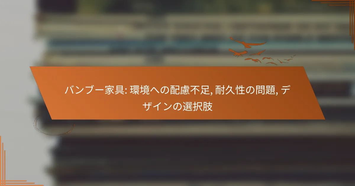 バンブー家具は、その持続可能性が注目される一方で、製造過程や廃棄方法における環境への配慮不足が課題となっています。また、耐久性は高いものの、使用環境やメンテナンスによって性能が変わるため、適切なケアが重要です。さらに、多様なデザインが揃っているため、個々のニーズに応じた選択が可能です。 バンブー家具の環境への配慮はどのようなものか? バンブー家具は、その持続可能性と環境への配慮が注目されていますが、実際には製造過程や廃棄方法において課題も存在します。これらの要素を理解することで、より良い選択が可能になります。 持続可能な素材としてのバンブーの特性 バンブーは成長が早く、再生可能な資源として知られています。一般的に、バンブーは数年で成熟し、伐採後も再生が可能です。この特性により、森林伐採の影響を軽減することができます。 また、バンブーは軽量でありながら強度が高く、家具としての耐久性も兼ね備えています。これにより、長期間使用できるため、環境への負担を減らすことができます。 製造過程における環境影響 バンブー家具の製造過程には、化学薬品の使用やエネルギー消費が伴います。特に、接着剤や塗料に含まれる有害物質が環境に影響を与える可能性があります。 さらに、製造工場の立地や運営方法によっては、地域の生態系に悪影響を及ぼすこともあります。持続可能な製造方法を選ぶことが重要です。 リサイクルと廃棄の観点からの評価 バンブー家具は、リサイクルが難しい場合があります。特に、接着剤や塗装が施されている場合、分解が困難になることがあります。 廃棄時には、バンブー自体は生分解性ですが、製品の状態によっては環境に悪影響を及ぼす可能性があります。適切な廃棄方法を選ぶことが求められます。 他の家具素材との比較 バンブーは、木材やプラスチックなどの他の家具素材と比較して、環境への配慮が高いとされています。特に、成長速度や再生可能性において優位性があります。 ただし、木材は長寿命であることが多く、耐久性の観点からは一概に優れているとは言えません。選択肢を比較する際には、使用目的やライフサイクルを考慮することが重要です。 消費者の環境意識の変化 近年、消費者の環境意識が高まっており、持続可能な製品の需要が増加しています。バンブー家具はそのニーズに応える形で注目を集めています。 消費者は、環境に優しい素材や製造過程を重視する傾向が強まっており、これが市場の動向にも影響を与えています。企業はこの変化に対応するため、透明性を持った情報提供が求められています。 バンブー家具の耐久性はどの程度か? バンブー家具は、一般的に耐久性が高いとされていますが、使用環境やメンテナンスによってその性能は大きく変わります。適切なケアを行うことで、長期間にわたって利用可能です。 バンブーの物理的特性と耐久性 バンブーは軽量でありながら強度が高く、木材の中でも特に耐久性に優れています。特に、バンブーの繊維は密度が高く、引っ張り強度が強いことから、家具としての使用に適しています。 また、バンブーは湿気に強く、カビや腐敗に対する抵抗力も持っています。これにより、屋内外での使用が可能ですが、適切な処理が施されていることが前提です。 使用環境による耐久性の変化 バンブー家具の耐久性は、使用環境に大きく影響されます。例えば、直射日光や高湿度の環境では、色あせや変形が起こりやすくなります。 屋外で使用する場合は、UVカットのコーティングを施すことで、耐久性を向上させることができます。逆に、乾燥した室内では、ひび割れのリスクが高まるため、湿度管理が重要です。 メンテナンス方法とその影響 定期的なメンテナンスは、バンブー家具の耐久性を保つために不可欠です。乾いた布での拭き掃除や、専用のオイルを使用することで、表面の保護が可能です。 また、過度な水分や洗剤の使用は、バンブーの劣化を招くため注意が必要です。適切なメンテナンスを行うことで、家具の寿命を延ばすことができます。 競合素材との耐久性比較 バンブーは、一般的な木材やプラスチックと比較しても、耐久性において優れた特性を持っています。例えば、オークやマホガニーと比べると、バンブーは軽量で扱いやすいですが、強度は同等以上です。 一方で、プラスチック製品は耐水性に優れていますが、見た目や質感で劣る場合があります。バンブーは自然素材であるため、環境への配慮も考慮した選択肢となります。 耐久性に関する消費者の誤解 バンブー家具は「すぐに壊れる」といった誤解が多いですが、実際には適切に使用すれば長持ちします。耐久性が低いと考えられる理由の一つは、安価な製品が多く流通しているためです。 高品質なバンブー家具を選ぶことで、耐久性の問題を避けることができます。信頼できるメーカーから購入することが重要です。 バンブー家具のデザ