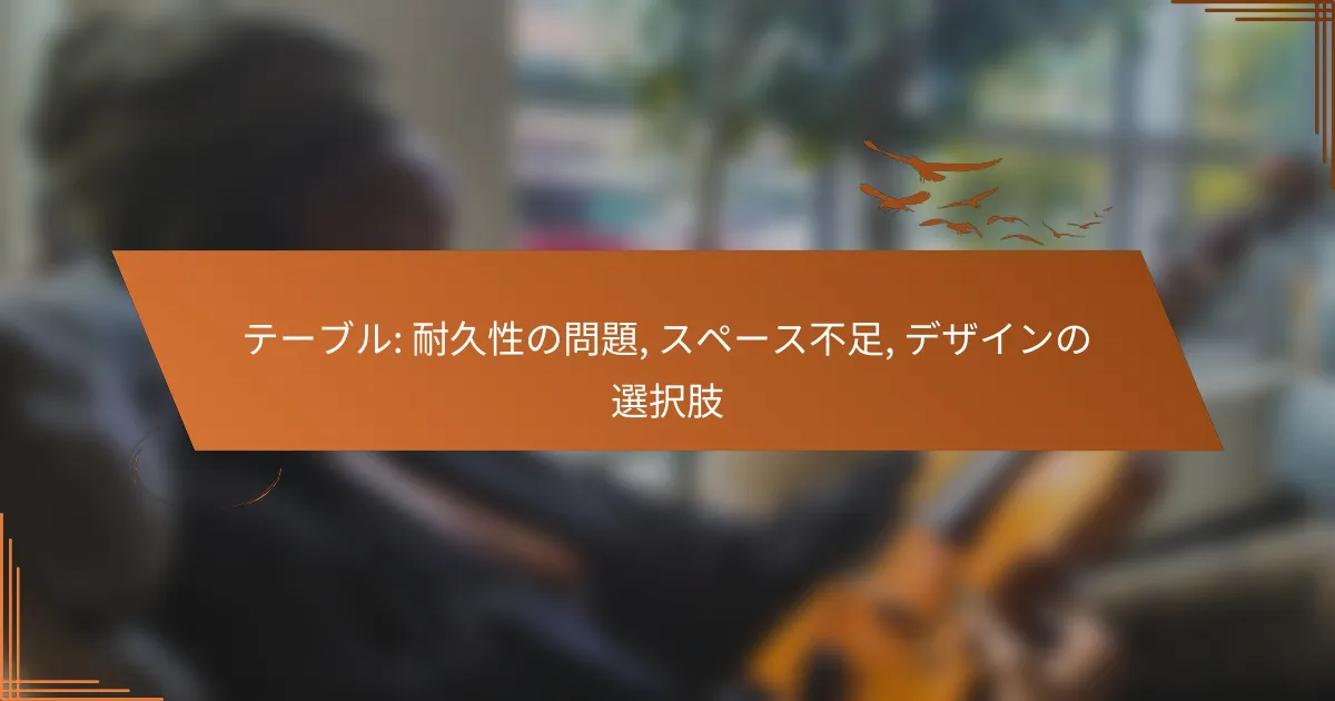 テーブル選びは、耐久性、スペースの有効活用、デザインの選択肢を考慮することが重要です。耐久性が低いテーブルは、長期間の使用に耐えられず、買い替えが必要になることがあります。また、限られたスペースを有効に使うためには、折りたたみテーブルなどの工夫が役立ちます。 テーブルの耐久性の問題とは何か? テーブルの耐久性の問題は、使用中に発生する劣化や損傷を指します。耐久性が低いと、長期間の使用に耐えられず、買い替えや修理が必要になることがあります。 耐久性の定義と重要性 耐久性とは、物が使用される環境や条件に対してどれだけ持ちこたえるかを示す指標です。特にテーブルの場合、日常的な使用や外部要因に対する耐性が求められます。 耐久性が高いテーブルは、長持ちし、頻繁なメンテナンスや交換の必要が減ります。これにより、コストを抑えることができ、環境にも優しい選択となります。 一般的な耐久性の問題の種類 テーブルの耐久性に関する問題には、傷、変色、ひび割れ、腐食などがあります。これらの問題は、使用する材料や環境によって異なります。 例えば、木製のテーブルは湿気や直射日光に弱く、金属製のテーブルは錆びる可能性があります。これらの問題を理解することで、適切な素材選びが可能になります。 耐久性に影響を与える要因 テーブルの耐久性には、使用する素材、製造方法、保管環境が大きく影響します。高品質な素材や適切な製造プロセスは、耐久性を向上させます。 また、テーブルを置く場所の温度や湿度も重要です。極端な環境条件は、テーブルの劣化を早めることがあります。 耐久性の評価基準 テーブルの耐久性を評価する基準には、耐荷重、耐水性、耐熱性などがあります。これらの基準は、使用目的に応じて重要度が変わります。 例えば、ダイニングテーブルは食事を支えるための耐荷重が重要ですが、アウトドア用テーブルは耐水性が求められます。 耐久性の向上方法 テーブルの耐久性を向上させるためには、適切なメンテナンスが不可欠です。定期的な清掃や保護剤の使用が効果的です。 また、使用環境を整えることも重要です。直射日光を避け、湿度を管理することで、テーブルの寿命を延ばすことができます。 スペース不足の解決策はどのようなものか? スペース不足の解決策には、効率的な家具の配置や収納方法の見直しが含まれます。特に、折りたたみテーブルや収納可能なデザインを取り入れることで、限られた空間を有効活用できます。 スペース不足の原因と影響 スペース不足は、特に都市部の住宅や小さなオフィスで一般的な問題です。家族構成の変化や物の増加が原因となり、生活空間が圧迫されることがあります。 この問題は、居住空間の快適さを低下させ、ストレスの原因にもなります。効率的なスペースの使い方を考えることが重要です。 スペースを最大限に活用する方法 スペースを最大限に活用するためには、家具の配置を工夫することが必要です。例えば、壁に沿って家具を配置することで、中央の空間を広く保つことができます。 また、多機能家具を選ぶことで、必要なときにだけスペースを占有することが可能です。例えば、収納付きのベンチや、引き出し式のテーブルなどが有効です。 折りたたみテーブルの利点 折りたたみテーブルは、必要なときだけ使用できるため、スペースを有効に使えます。使用しないときは簡単に収納でき、部屋を広く保つことができます。 さらに、折りたたみテーブルは軽量で持ち運びが容易なため、屋外での使用やイベントにも適しています。これにより、シーンに応じた柔軟な利用が可能です。 収納可能なデザインの選択肢 収納可能なデザインの家具には、引き出しやキャビネットが組み込まれたものがあります。これにより、物を整理整頓しやすく、見た目もすっきりします。 また、壁掛け式の棚や収納ボックスを利用することで、床面積を占有せずに物を収納できます。これらの選択肢を取り入れることで、スペース不足を効果的に解消できます。 テーブルのデザイン選択肢はどのように決めるか? テーブルのデザイン選択肢は、使用目的やスペース、耐久性を考慮して決定します。これにより、機能性と美しさを兼ね備えたテーブルを選ぶことができます。 デザインの種類と特徴 テーブルのデザインには、モダン、クラシック、ミニマリストなど様々なスタイルがあります。モダンデザインはシンプルで洗練された印象を与え、クラシックデザインは伝統的な美しさを持っています。ミニマリストデザインは、無駄を省いた機能性重視のスタイルです。 それぞれのデザインは、使用する場所や目的によって適切な選択が異なります。例えば、オフィスではモダンなデザインが好まれることが多いですが、家庭のダイニングルームではクラシックなスタイルが人気です。 使用目的に応じたデザインの選び方 テーブルの使用目的に応じてデザインを選ぶ